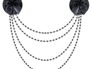 Paris Hollywood Brustwarzenabdeckung, luxuriös, Schwarz mit satinierter Schleife, verbunden mit Perlenketten