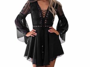Goosuny Damen Abendkleid Kurz Spitze Sommerkleider Flare Sleeve Langarm Kleid V Ausschnitt Enge Minikleid Sexy…