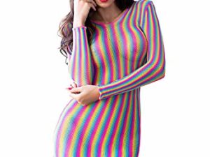 Auffälliges Minikleid aus elastischem Netzmaterial mit regenbogenfarbenen, vertikalen Streifen, die Ihrer Figur schmeicheln.