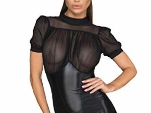 Minikleid mit hinterer Schnürung, gefertigt aus mattem Wetlook-Material und durchsichtigem Tüll.